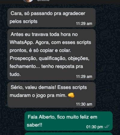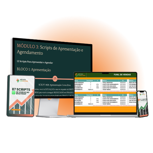 Chega de travar quando o lead pergunta o preço ou diz “Vou pensar”. 87 scripts testados, divididos em 7 módulos que cobrem TODAS as etapas: Prospecção, Qualificação, Apresentação, Objeções, Fechamento, Follow-up e Automações. Escolha o script, copie, cole e envie. Em 5 minutos você está pronto para converter.