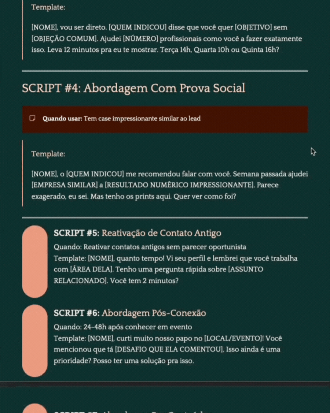 Escolha o script certo para cada situação. Copie, personalize com o nome do lead, e envie. Sem improviso, sem travar, sem perder tempo pensando no que falar.